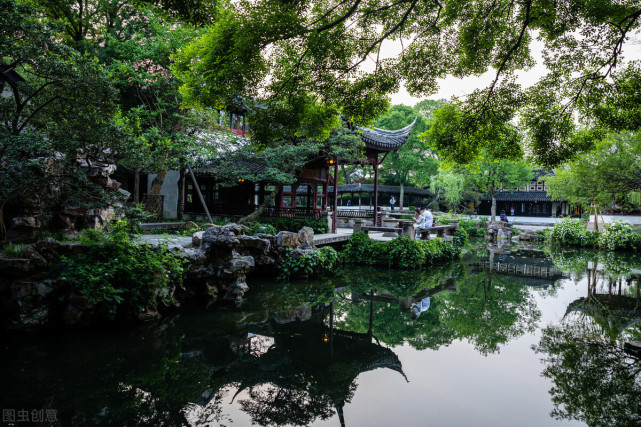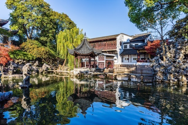 拙政园,山水萦绕,厅榭精美,花木繁茂,是苏式园林的代表,被誉为“天下园林之典”。