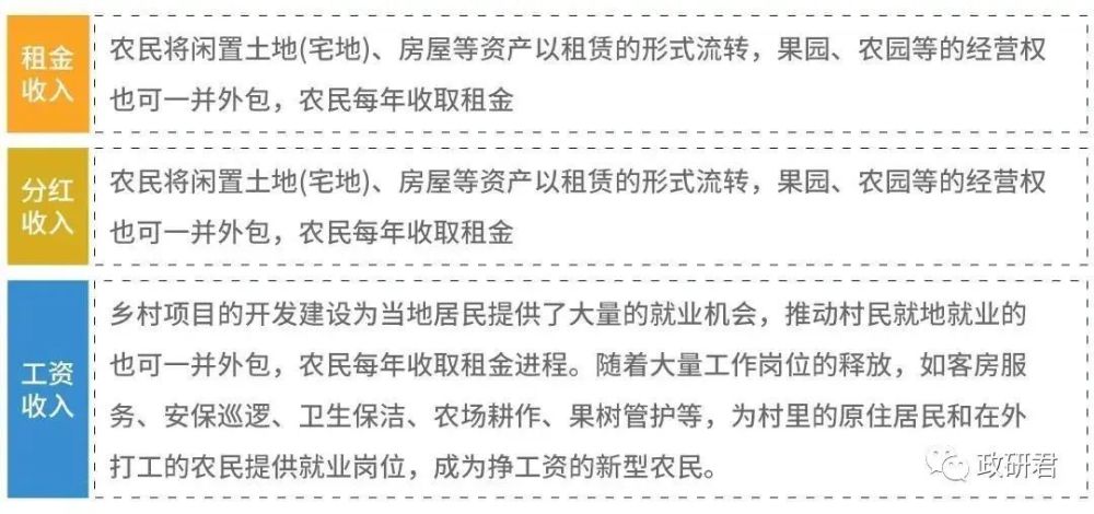 ②农民——租金、分红、工资等收入 乡村项目中,农民是最直接的受益者。其收入来源主要分为三部分,即租金收入、分红收入及工资收入。