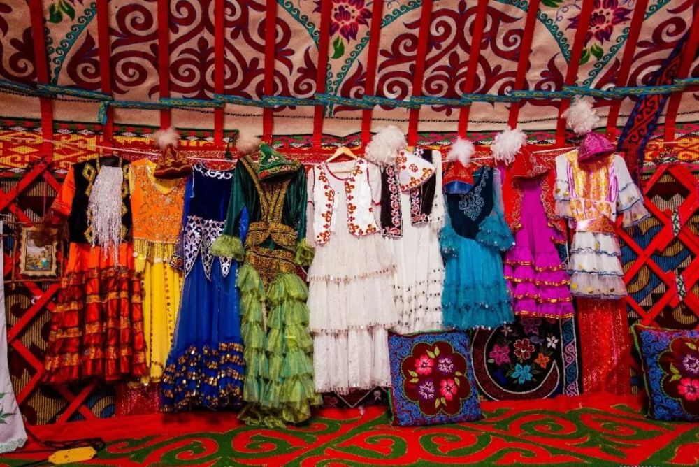 哈萨克刺绣是哈萨克族服饰中最有代表意义的一种装饰工艺,在草原石人哈萨克民族文化园的首领大毡房里看到哈萨克族朋友的衣服、裙子,床炕,还有室内装饰用品上,都点缀着哈萨克族精湛的绣品。