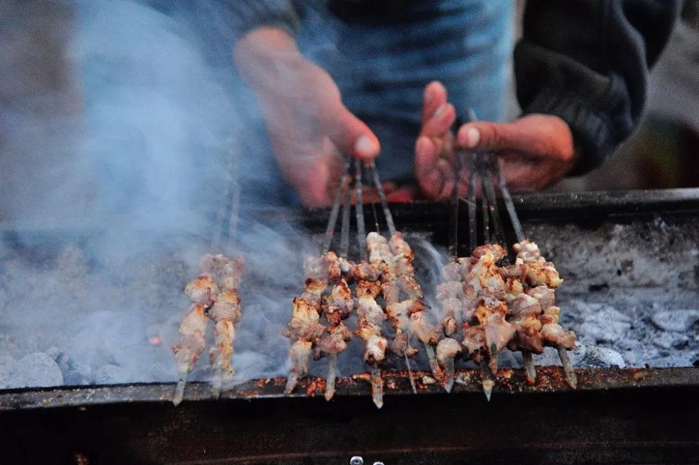 疆羊肉串色泽酱黄油亮,肉质鲜嫩软脆,味道麻辣醇香,独具特别风味。当肉烤成白色(牛肉呈紫红色)时盛入盘中。撒上大盐粒子,可就着馕吃。