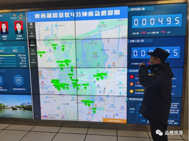 打造智慧化应急指挥调度系统,构建景区“4分钟应急救援圈”,为老年人营造安全有序、响应迅速的游览环境。依托瘦西湖应急指挥中心,集成实时监控、调度、应急广播、智能定位对讲等系统,联动景区派出所、瘦西湖特勤队、瘦西湖医务室等力量,形成了一张全园覆盖、职责明确的安全网,实现对园区突发老年人中暑、失足落水、跌倒等事件的发现、处置和救援,把握住4分钟黄金救援时机。同时,通过“警景联动”,联合应用“扬州旅游警察实战应用平台”,根据LBS人流量监测系统,对人员密集、可能对老年人造成危险的区域、点位加大执勤力量,增加监控、应急医疗等资源和设施投入,共配备监控300个、应急广播32个、5G定位对讲机105个等。