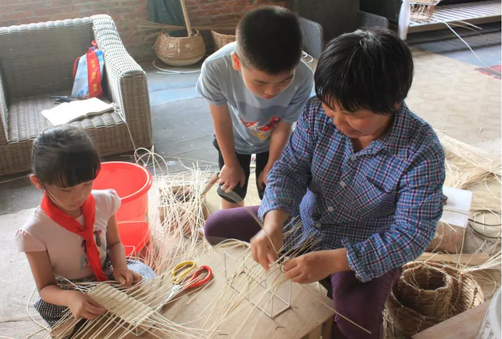 藤编技艺的传承——小朋友正在跟编织工人学习藤编技艺