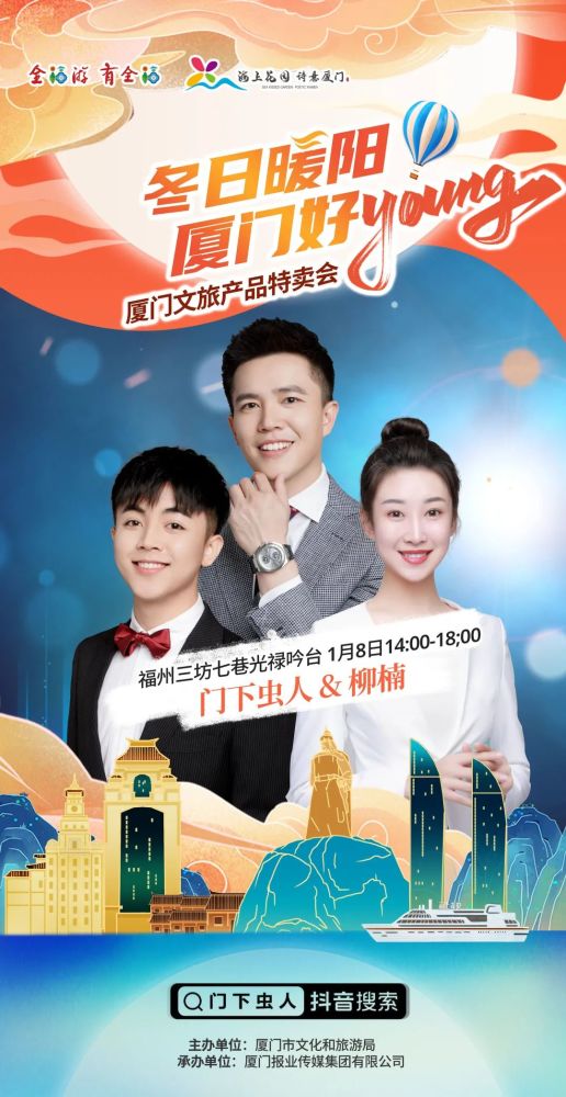 今天16:00-20:00,在沙坡尾大戏台,抖音达人“超可爱的吴宝宝”、金牌导游黄城、旅行推荐官陈莹等3位知名主播将在4个小时的直播里,为大家奉上“厦门好young”榜单TOP30旅游度假产品。不仅有厦门冬季的度假必打卡点,还有最新的璀璨夜间游及金鸡影视游景点推荐。