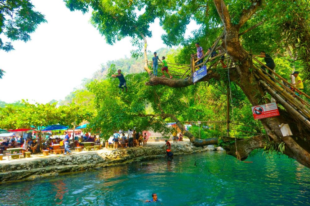 除了探险溶洞,来万荣户外跳水也是一件十分刺激的事情, 蓝色泻湖是万荣一个典型的蓝色湖泊,蓝色泻湖分为一号蓝色泻湖,二号蓝色泻湖和三号蓝色泻湖, 每一个景点都是值得一去,其中,一号蓝色泻湖便是最美的一个。走进蓝色泻湖景区,就看见当地老挝小孩在树下一个个往蓝色的湖里跳水,在当地小孩的带领下,很多游客也会参与其中的跳水,虽然站在十米高的树干有点害怕,但是为了锻炼胆量,游客都会完成各自的跳水挑战。