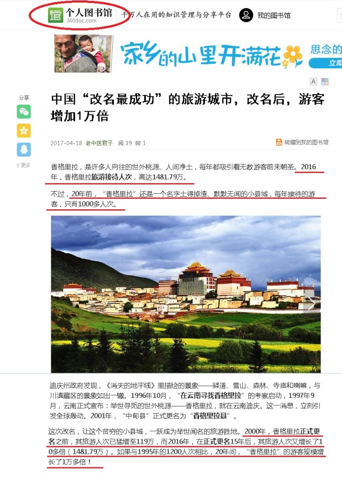 1999年,云南迪庆州中甸县旅游起步之时旅游总收入3000万。二十世纪之初中甸县通过策划运作更名香格里拉之后,2016年,香格里拉市实现旅游总收入150亿,十多年时间就增加了500倍!游客从1995年的1200人变成了2016年的1200万!仅用了十多年,游客量就增长了一万倍!创造了旅游业投资最小、增长最快的世界纪录!香格里拉案例被称为"世界旅游第一奇迹"!