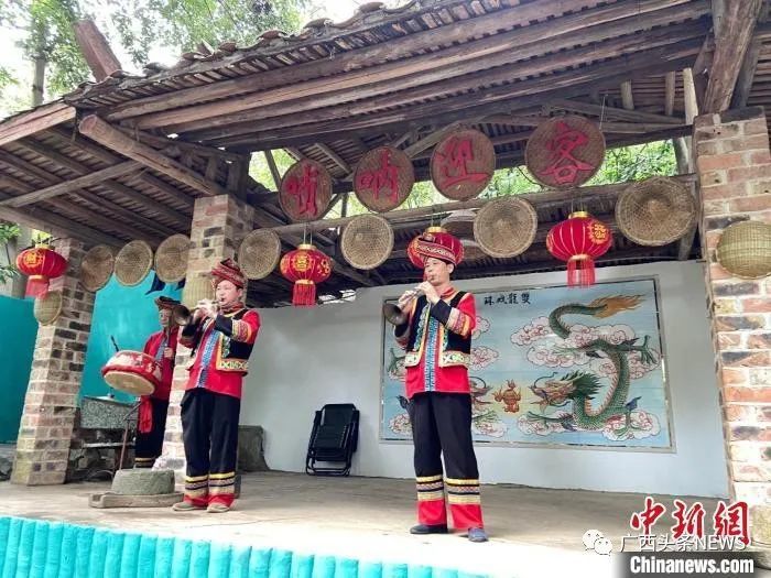 伊岭岩风景区内山清水秀,洞幽石奇,民族风情浓郁,是观光、度假、休闲的旅游胜地。图为景区内工作人员吹奏唢呐迎客。林洁琪 摄