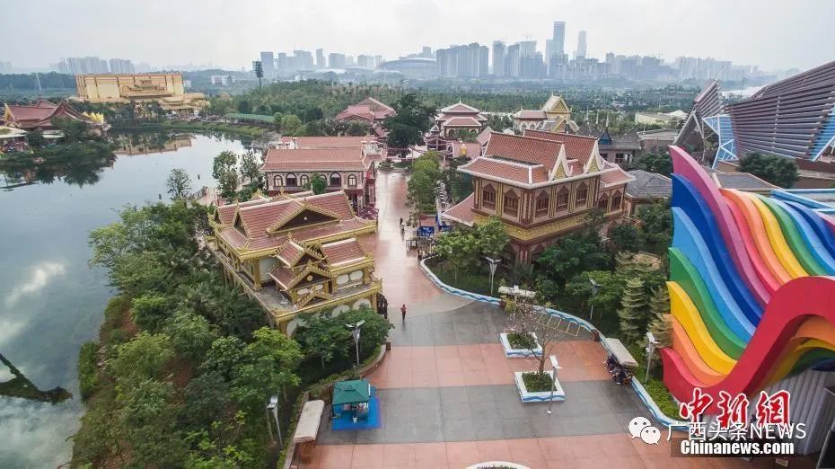 方特东盟神画是国内首个全面展示东盟十国自然历史文化的主题乐园,是充满东南亚异域风情的文化博览园。图为航拍方特东盟神画。陈冠言 摄