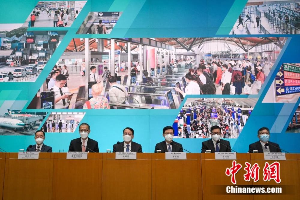 香港特区行政长官李家超(右三)5日带领一众特区政府官员公布香港与内地“通关”细节。陈永诺 摄