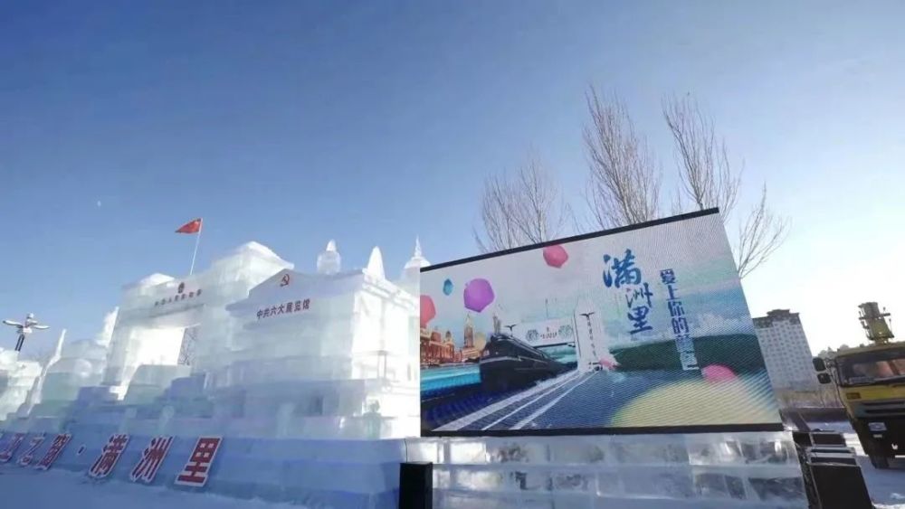 满洲里市参展的冰雕作品主题为“东亚之窗—满洲里”,以“新时代·新征程”为创作背景,集中展示满洲里新时代成就展,冰雕作品整体长25米,宽5米,高7米,由第五代国门、中欧班列、中共六大展览馆、中俄边境旅游区、俄式特色建筑等元素构成。采用双面立体精雕工艺和区域雷射灯光技术,使冰雕作品效果更加恢宏大气、美轮美奂。现场增设了电子屏,播放满洲里旅游宣传片,集中展示满洲里四季旅游资源,烘托冰雕作品整体效果更加饱满,充满着异域风貌,孕育着新的希望。