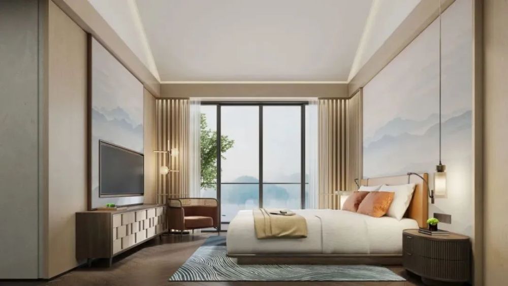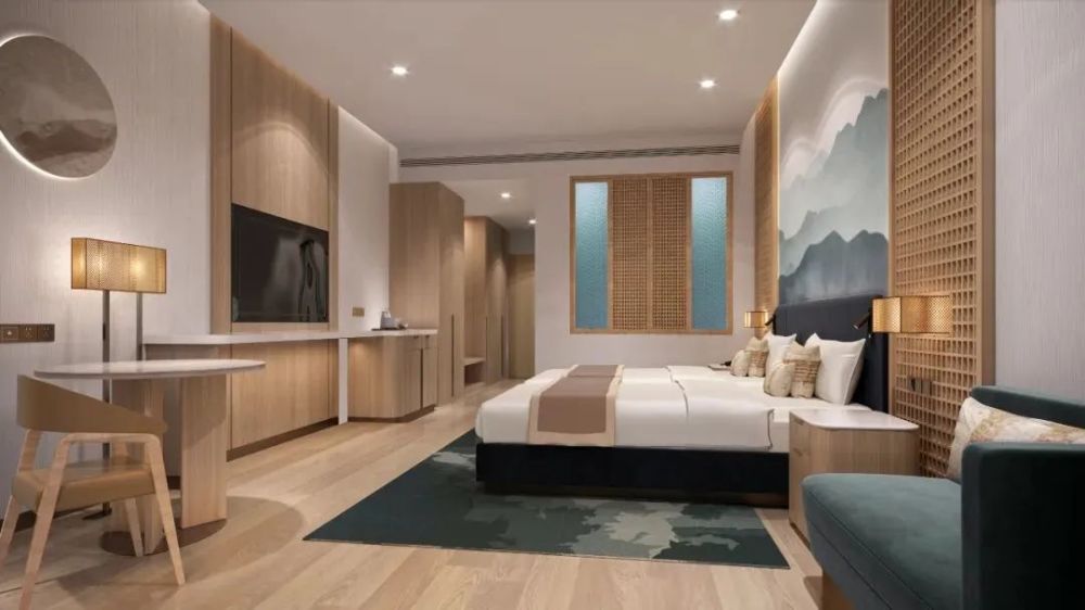 度假村整体设计以江南秀水,国风立意,新中式的室内装潢融合当地“山”与“水”的元素,将江南的写意山水在千岛湖畔展现的淋漓尽致。