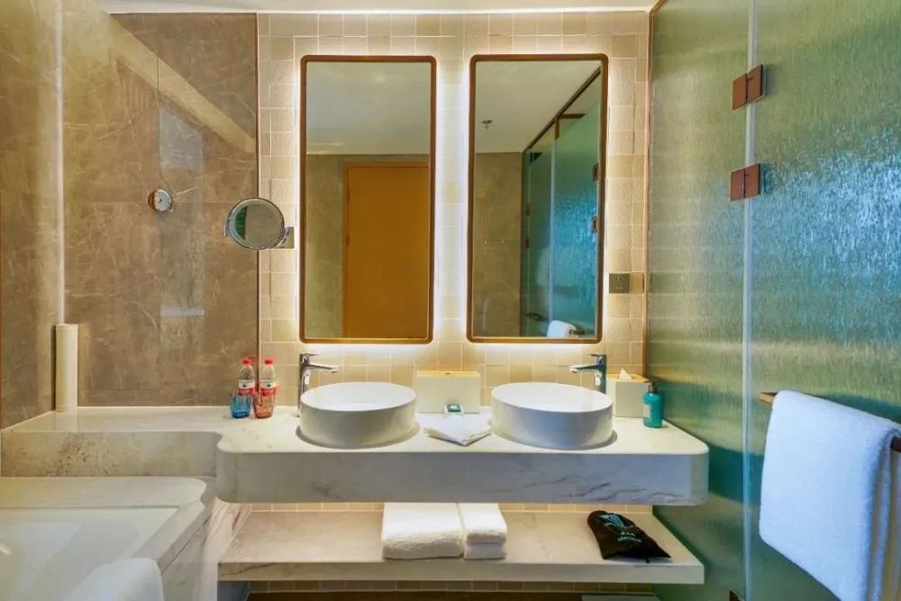 干湿分离的浴室,镶嵌式的大浴缸和双洗手台的高级配置,将私密性和度假性的追求做到了极致。