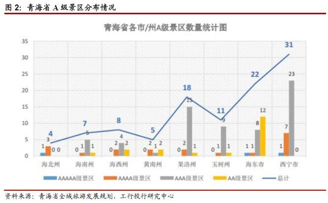 目前,青海省共有A级景区108家,其中国家5A级旅游景区3家,4A级旅游景区24家,3A级旅游景区62家,国家2A级旅游景区19家。青海优质旅游景区聚集,但东西发展不均衡,其三个5A级旅游景区分别位于青海东部的西宁市、海东市、海北州三市/州;主要的A级景区集中分布在东部的西宁市、海东市、果洛州,三个市/州A级景区数量占到青海总量的67.0%。截止2017年底统计,青海省拥有1个世界自然遗产、1个世界地质公园,1个国家风景名胜区、1个国家生态公园、1个国家矿山公园、2个国家公园,7个国家森林公园、8个国家沙漠公园、8个国家自然保护区、9个国家地质公园、13个国家水利风景区和19个国家湿地公园。此外,还拥有4个世界级非物质文化遗产、73个国家级非物质文化遗产,以及1个国家历史文化名城、1个国家遗址公园、3个国家级文化生态保护实验区、6个国家历史文化名镇名村、44个全国文物保护单位和79个中国传统村落。