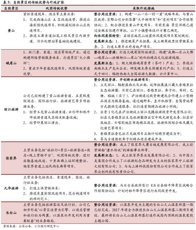 目前,国内部分大型景区在经营过程中开始探索多渠道的经营模式,开始利用有限的资源向“酒店+餐饮+旅行社+演艺”的方向发展,形成“门票+酒店+餐饮+演艺+交通+旅行社+文创产品”的多头盈利模式。有的景区甚至会开发景区独有的线上游戏,供游客排队等待时或回家后继续体验。与此同时,景区也在尝试外延式扩张的道路。另一方面,自然景区开始采取外延扩张战略,尝试开拓全新业务链条,以期增加盈利能力及抗风险能力。自然景区的外延扩张一般包括三条主线:第一,向全域旅游方向发展,整合周边旅游资源,从单一景区转变为景区带串联,打造区域特色旅游品牌,延长游客在当地驻足时间。第二,顺应消费升级大趋势,向休闲度假方面转型,吸引短途周边游游客,增加重游率。第三,发展新兴产业,提高抗风险能力。自然景区发展进入成熟期,很多景区业务增长日趋平稳,自然景区的外延扩张是未来发展的主要看点。