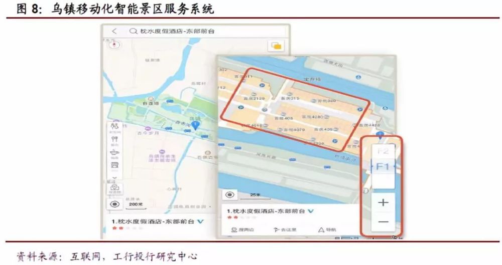 乌镇在国际互联网大会上提供的“活地图”大放异彩。乌镇与高德地图合作,将过去只能印刷在纸上的景区地图变成了一张手机上的“活地图”。高德地图为乌镇提供了包括景区导航、明星语音导游、室内地图、活动地点信息更新等在内的基于移动互联网的智慧景区服务,游客还可以通过语音进行搜索,比如说“我要上厕所/喝咖啡”,地图就会自动规划出最便捷的路线。此外,乌镇景区还与高德地图联手研发了全套室内地图解决方案,对景区内的度假酒店还绘制了室内地图,精细到每一间会议室、餐厅、服务台、楼梯和卫生间等,地图标尺最小可达5米,更可以轻松切换1、2、3层,并支持室内搜索。同时乌镇景区举办的戏剧演出、商务会议论坛等信息也都会在地图上的相应地点动态显示。可以说,“互联网+景区”的新型景区经营理念为传统而古老的乌镇景区增添了一份现代的美感。除乌镇之外,位于北京郊区的古北水镇也开始利用移动化智能景区服务平台,解决了之前游客在景区容易遇到的迷路、拥堵、排队、信息滞后等问题。