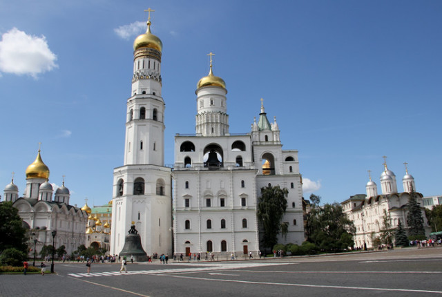 在接下来要给大家介绍到的这个景点是伊凡大帝钟楼,它是在伊凡大帝在世的时候所建立起来的,在当时成为了一个非常具有代表性的权力象征,同时也是那一个时期莫斯科这座城市之内最高的一个建筑。钟楼的主体建筑耗时三年,是在十六世纪初所建立起来的,它是由意大利非常著名的设计事务所设计建造的,而后人们又在这样一个高大钟楼的顶部再加上了更为高大的另一个钟楼。虽然说在战争时期它也曾经遭受过大范围的损毁,但是还是保存下来的建筑的大题部分,并且遗留下来了十八个钟。在尽力的修复之后很快就恢复了教堂的所有功能,但是现在我们已经不能够攀登上钟楼来眺望远方了。