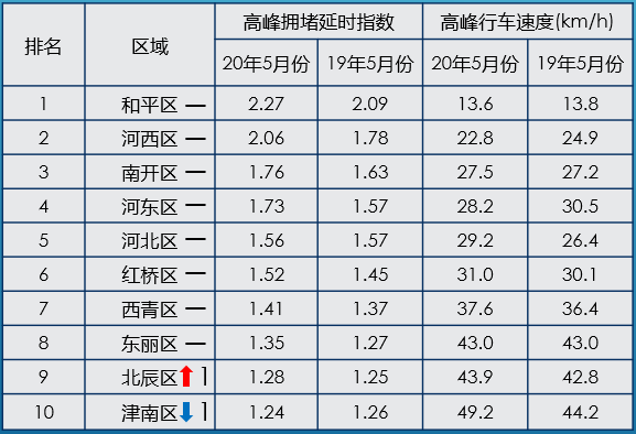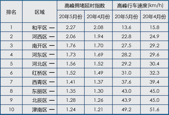 以2020年5月为例,从数据中可以看出,与上月对比中,由于疫情后企业陆续复工复产,全市各区5月相较4月的拥堵指数有明显的增加;与去年同期对比中,由于天津市采取不限行措施,拥堵指数相较去年5月也是有所增加的。