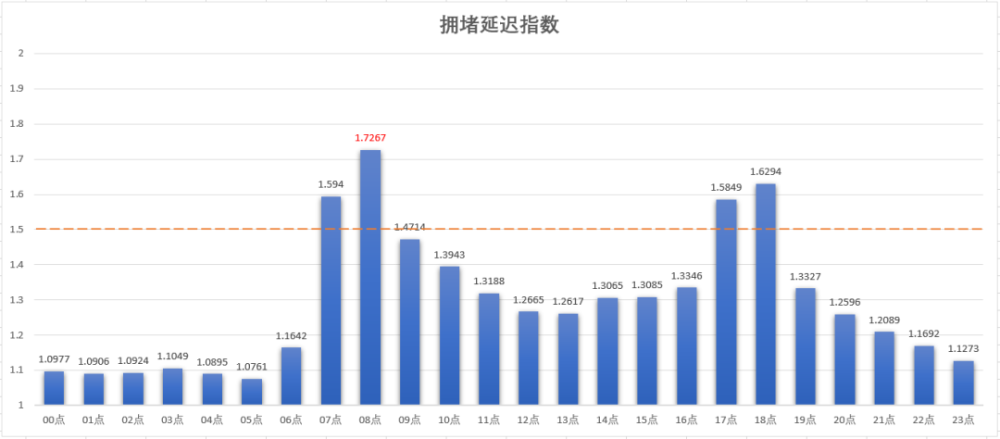 根据交通拥堵延时指数预警(拥堵指数阈值为1.5),5月份天津市工作日7-8时、17-18时两时段,拥堵延时指数超过阈值。其中上午8时为全天拥堵最严重的时段。