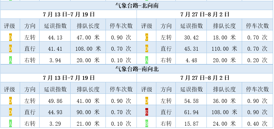 以吴家窑大街与气象台路交叉口为例,此路口为施工中心区域,由表中各个方向的评级可以看出施工以后吴家窑大街东向西左转,西向东右转,气象台路南向北直行延误指数相较施工前有明显升高。