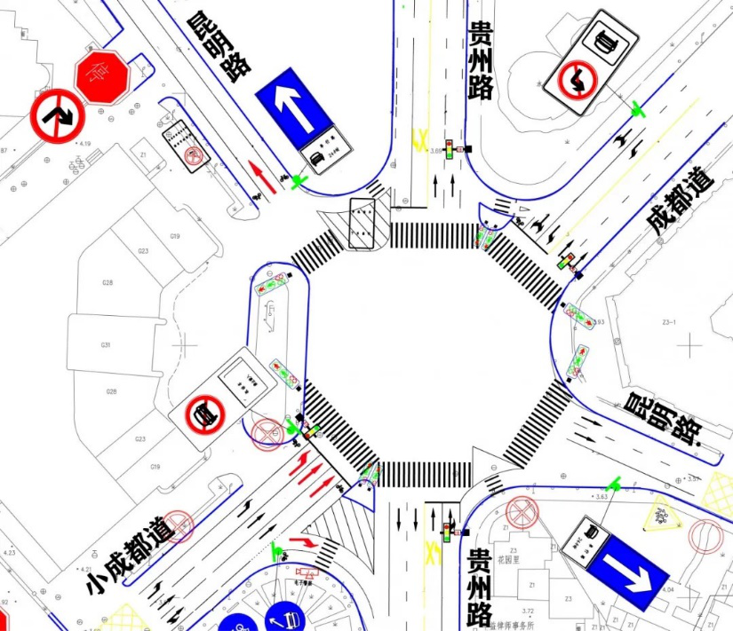 通过参考互联网平台中各项交通参数的评估数据,交管部门对绕行路线中流量变化较大的远端路口成都道与贵州路交叉口的交通组织进行了调整,红色指示箭头为调整后的渠化,将小成都道由原来的双向行驶改为由西向东单向行驶,昆明路北断面由原来的北向南单行路改为由南向北的单行路。