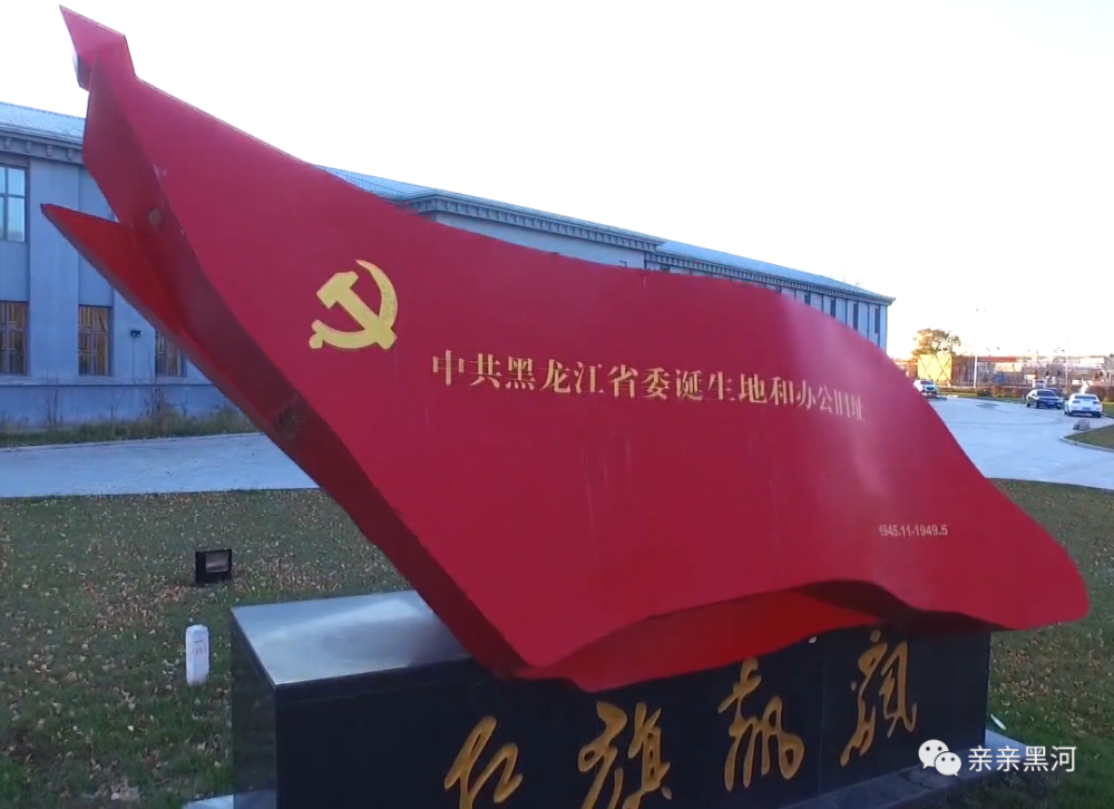 旧址楼前绿色的草坪上,矗立一座雕塑,底座是黑色大理石,刻着“红旗飘飘”四个金黄色大字,底座上面是党旗雕塑,上面写着“中共黑龙江省工作委员会旧址1945.11-1949.5”,字也是金黄色的。雕塑背面是北安红色历程的文字介绍。这座雕塑提示我们,这里是老一辈无产阶级革命家曾经工作过的地方。