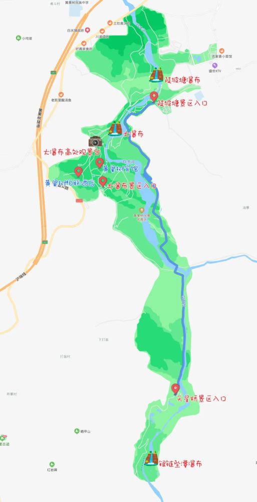 黄果树瀑布景区非常的大,这里是一个瀑布群,除了大家耳熟能详的大瀑布,这边分为三个区域,在地图上从北往南分别是:陡坡塘、大瀑布和天星桥。