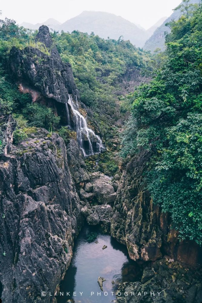 经过将近1个半小时的行走,最后才来到下半段最主要的景点:银链坠潭瀑布。瀑布及不上大瀑布的壮观,但其独特的形态依然可以成为景区里亮丽的三大头牌之一。