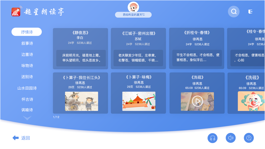 这里,有朗读资源24000+,专业音频500+,包括诗歌散文、唐诗宋词、亲子儿童、经典文学选段、外语名篇(带译文)等,同时针对一些比较热门的文学作品,系统可以实现自动推荐;而对于一些篇幅比较长的作品,可以进行选段等人性化设置,为朗读者提供了一处高品质的朗读体验空间。