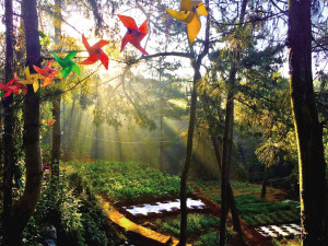 阳光绿树映着彩色风车,“鸟塘”环境静谧优美