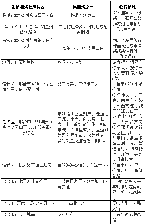 根据往年数据显示,交警部门预测,节日期间,市民多选择城区周边游,以短途客流为主,各大景区、商超及出入城区周边道路车流量将增大,交通压力呈上升趋势。其中,端午假期前一天(6月2日)下午起,全市车流会有明显增长,至端午当日10时许全市车流量达到峰值,城市道路拥堵主要集中在进出城道路。6月5日为返程拥堵高峰,15时至18时拥堵程度较高。请市民合理安排出行时间,注意错峰出行。