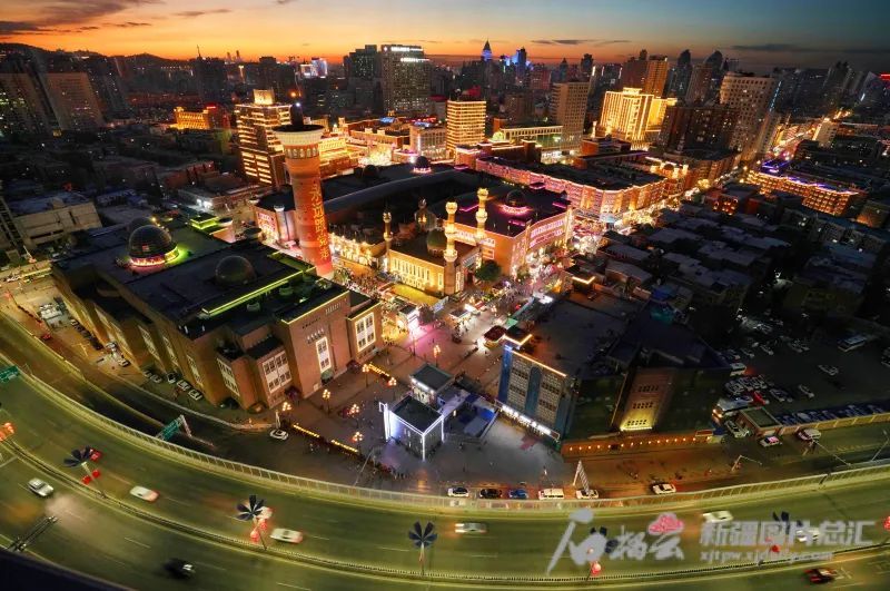 新疆国际大巴扎景区灯光秀和周边的夜景。石榴云/新疆日报记者王琦铭摄
