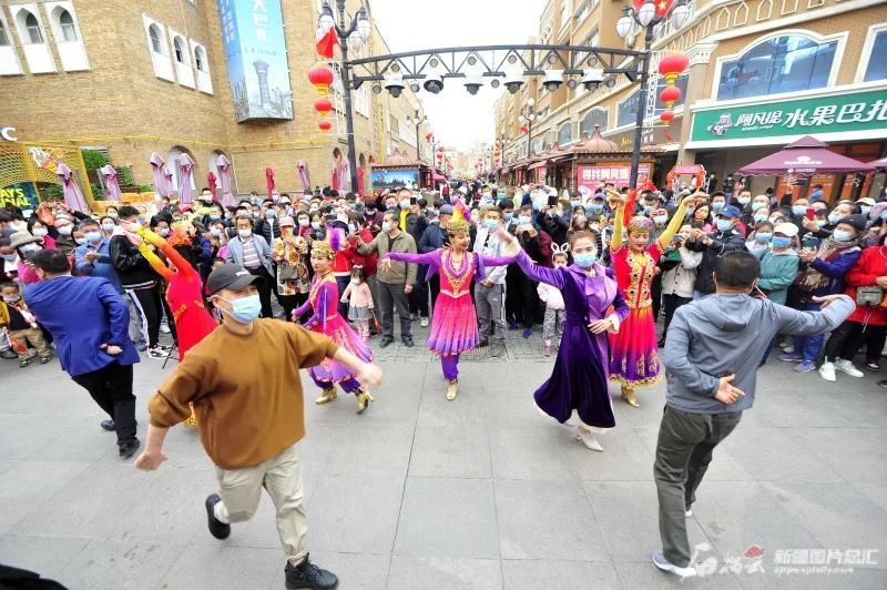 10月1日,在新疆国际大巴扎步行街前,身着民族服饰的维吾尔族姑娘与游客们一起跳起了欢快的麦西热甫。石榴云/新疆日报记者秦鹏摄