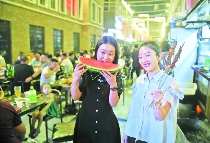游客在库尔勒丝路旅游小镇夜市品尝美食。记者汤永摄