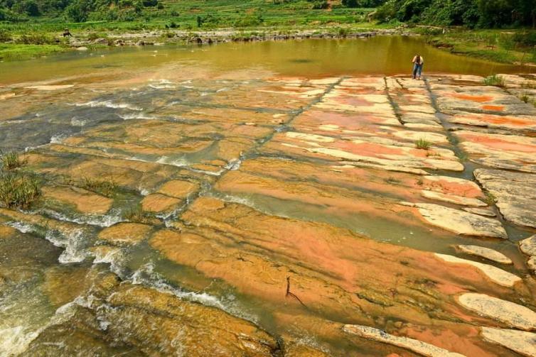 位于田东那拔镇福星村,棋盘滩石块大小均匀,整齐划一地排成横竖列,犹如一个巨大的棋盘,令人称绝。溪流汇聚在棋盘周围,石块宛如流动的棋子,趣味十足。棋盘滩面积约有3000多平方米,“棋盘”由一块块浮出水面的,大小为1平方米左右的石块组成,每一块石块的四周都被深、宽都在30厘米,纵横交错,互相贯通的水沟围绕,而且常年流水潺潺,人在“棋子”上可以任意走动,水不湿脚。
