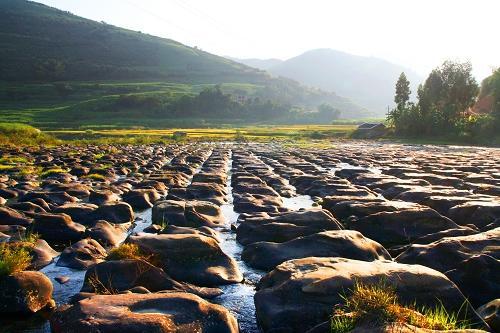 千百年来,不论狂风大雨,还是山洪爆发,风雨过后,棋盘滩中的每一颗石子丝毫不动,固若金汤。不论是角度,还是线条,依然保持原来的姿势,立于河之中央,从而没有一颗石子发生偏转或移位现象,只有石子的边缘被流水磨去了棱角,记录着岁月的痕迹。