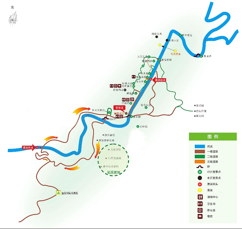 大门—杨家岩—九子溪—大禹广场—晃晃悠—水系—泳池—情人桥—白马山—新娘面纱—东干渠—胡家岩—地貌分界线—三叠池—九子溪电站—篮球场—光明食府—思源树—沮河国家湿地公园—北门电站—雷竹园。