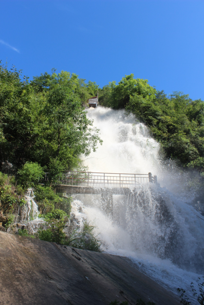 在情人桥旁的飞瀑,水流沿平整岩面直泄而下,略呈扇形,宛如新娘的面纱,或别致,或恢弘,带给游客深刻的艺术观水体验。水流撞击岩石,水花四溅,犹如喷雾行云,阳光透过水雾呈现出一道道绚丽的彩虹,游客身临其境,人行虹移,亦梦亦幻。