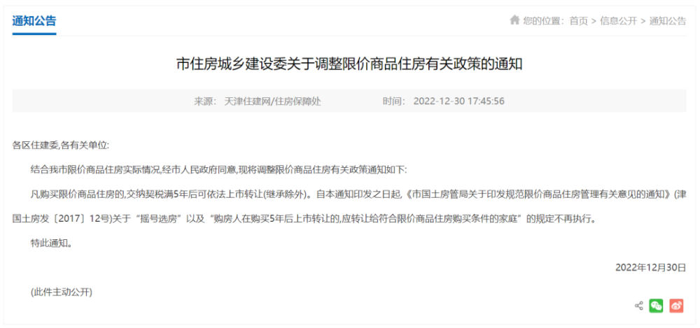 去年底,天津市住房城乡建设委发布关于调整限价商品住房有关政策的通知,明确规定凡购买限价商品住房的交纳契税满5年后可依法上市转让(继承除外)。