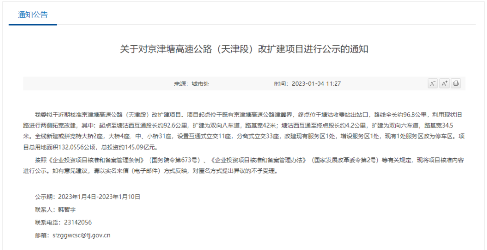 1月4日,天津市发改委网站发布“关于对京津塘高速公路(天津段)改扩建项目进行公示的通知”并进行公示,投资约145亿元,其中明确扩建为双向车道,全线新建或拼宽特大桥2座,大桥4座,中、小桥31座,设置互通式立交11座,分离式立交33座。