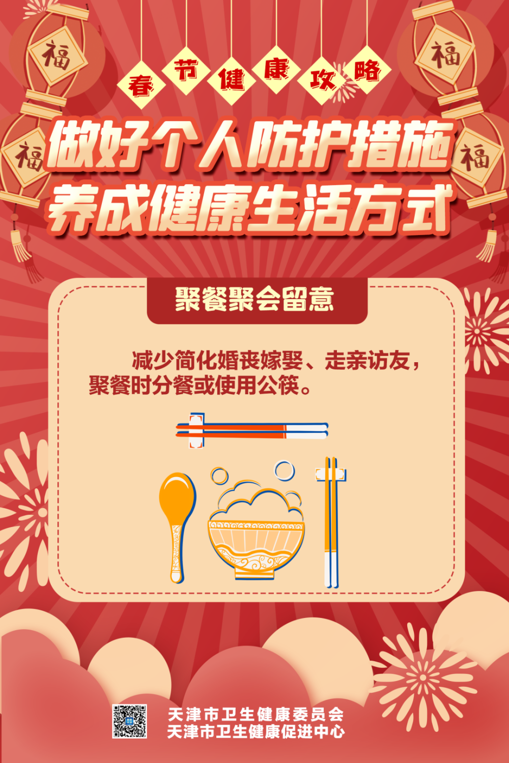 日前,天津市卫生健康委发布“春节健康攻略”,提醒市民注意个人卫生、学会咳嗽礼仪、做好健康监测等,做好个人防护措施,养成健康生活方式。