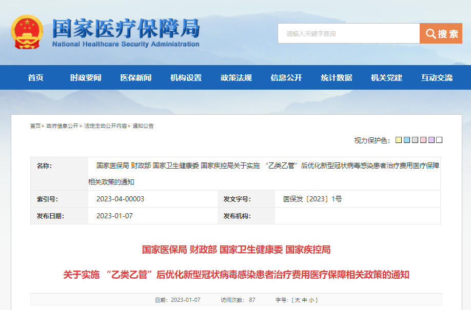 国家医保局、财政部、国家卫生健康委、国家疾控局1月7日发出《关于实施 “乙类乙管”后优化新型冠状病毒感染患者治疗费用医疗保障相关政策的通知 》。其中明确,新冠病毒治疗药品延续医保临时支付政策先行执行至3月31日。