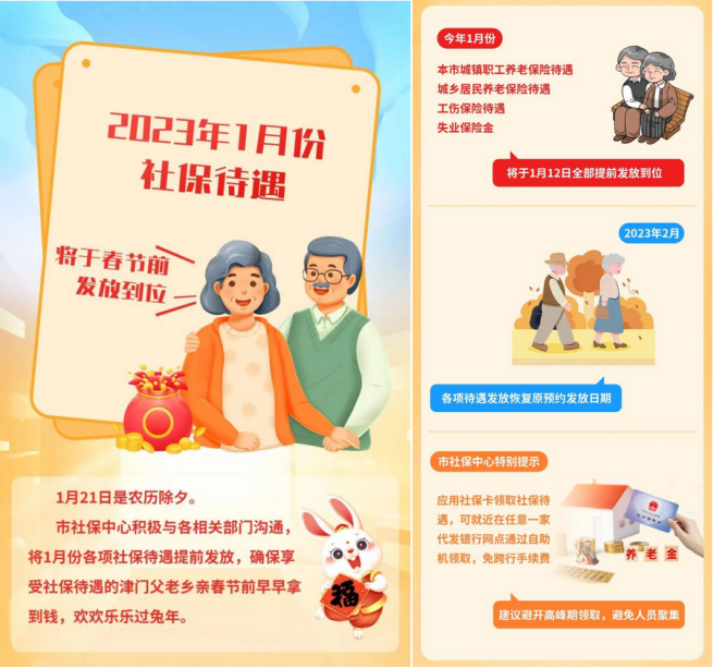 据“天津人社”微信公众号消息,2023年1月份社保待遇将于春节前发放到位。