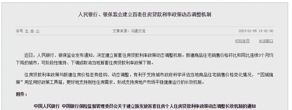 近日,人民银行、银保监会发布通知,决定建立首套住房贷款利率政策动态调整机制。新建商品住宅销售价格环比和同比连续3个月均下降的城市,可阶段性维持、下调或取消当地首套住房贷款利率政策下限。(详情)住建部部长发声→(详情)
