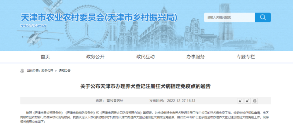 近日,天津市农业农村委认定以下266家动物诊疗机构为天津市办理养犬登记注册狂犬病指定免疫点,自2023年1月1日起承担全市办理养犬登记注册的狂犬病免疫工作。