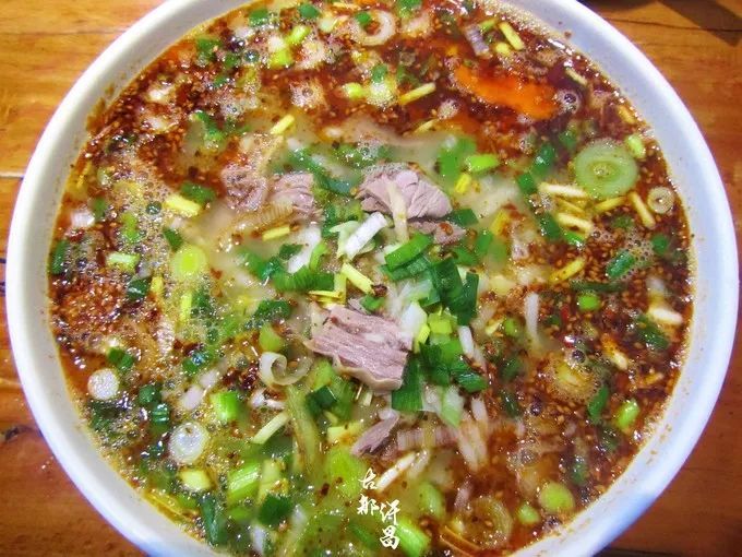 饸饹,原本是用饸饹床子把和好的面团轧成滚圆长面条,直接扔进开水锅煮熟,配上熟羊肉、葱花及茴香、花椒、胡椒等熬制的羊肉高汤,熬上一天的高汤,既去了羊肉的膻气,又消减了羊肉的火气十分滋补,吃起来香而不腻,味道鲜美。特别是色鲜味美的辣椒油等调味品,更是别具一格,色、香、味俱佳。