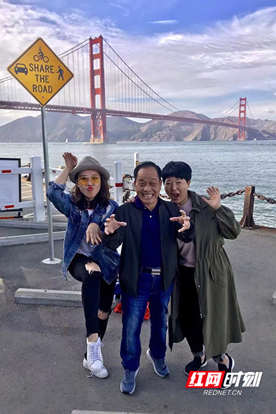 2018年,张馨文和父母在美国旧金山金门大桥。