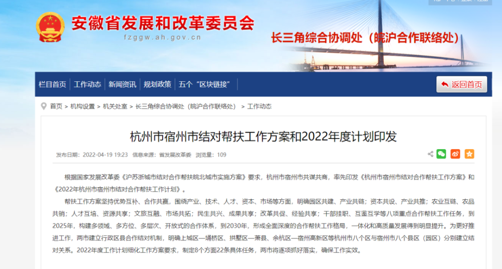 近日,根据国家发展改革委《沪苏浙城市结对合作帮扶皖北城市实施方案》要求,杭州市宿州市共谋共商,率先印发《杭州市宿州市结对合作帮扶工作方案》和《2022年杭州市宿州市结对合作帮扶工作计划》。