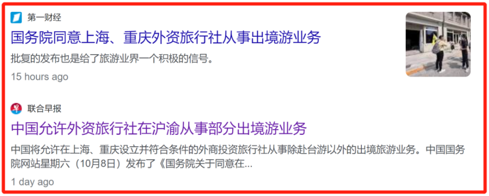10月8日,国务院发布《关于同意在天津、上海、海南、重庆暂时调整实施有关行政法规规定的批复》。其中,允许在上海、重庆设立并符合条件的外商投资旅行社从事除台湾地区以外的出境旅游业务。