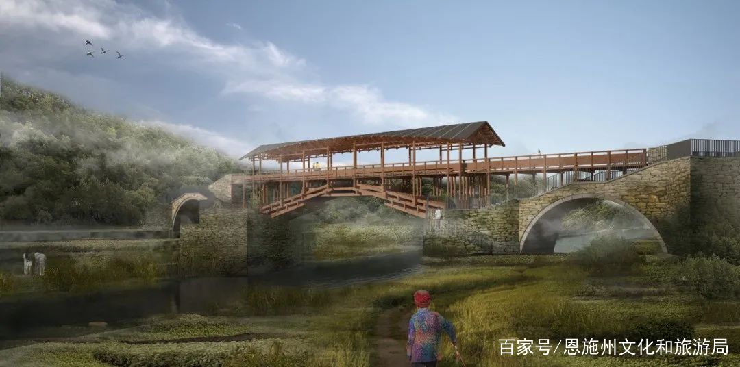 地仙桥——“人间幸有彭家寨,楼阁峥嵘住地仙。”地仙桥是从摩霄楼到木匠博物馆、舍巴田园、古吊脚楼群的重要通道,也是彭家寨居民进出寨、歇茶歇脚、文艺表演的场所。桥梁全长86米,采取传统石结构与现代木结构工艺相结合,同时考虑立体交通功能,游客可直行,也可通过阶梯下河亲水。地仙桥造型像一片树叶飘逸在龙潭河上,与彭家寨景区融为一体,象征居民和游客过着神仙一般的日子。