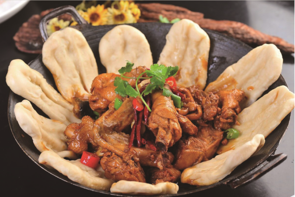 凤阳地锅鸡是一道特色农家土菜,主要食材有鸡肉、鸡蛋、白面粉和玉米粉。取一小泥炉,炉上坐一口铁锅,下面支几块干柴生火,然后按家常的做法煮上一锅菜,锅边还要贴满面饼,地锅菜的汤汁较少,口味鲜醇,饼借菜味,菜借饼香,具有软滑和干香并存的特点。
