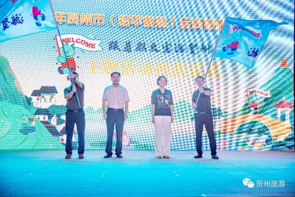 贺州市文化广电和旅游局党组书记、局长邹红英,广西黄姚古镇旅游文化产业区管理委员会党工委副书记、主任汤松波现场为参加“跟着麒大宝游贺州”主题活动的桂林福达文旅股份有限公司、广东中旅(深圳)旅行社有限公司授旗。